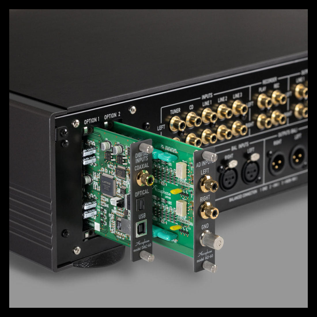 Vous avez ainsi la possibilité d'intégrer une préamplification phono MM/MC AD-60 ou un convertisseur numérique/analogique DAC-60.