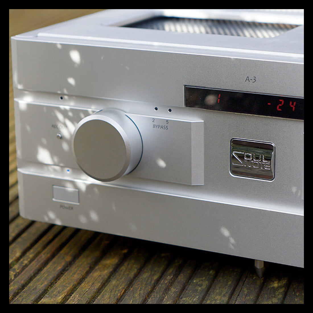 Le Soulnote A-3 est un amplificateur haut de gamme purement analogique, doté de six entrées analogiques (3 XLR, 3 Cinch) et dépourvu d'entrées numériques ou phono. La symétrie est au cœur de sa conception, avec des canaux droit et gauche entièrement séparés, jusqu'à une dérivation distincte de la masse. De plus, les signaux de commande, comme ceux provenant du contrôleur de niveau ou du sélecteur d'entrée, sont isolés du chemin du signal par un optocoupleur.