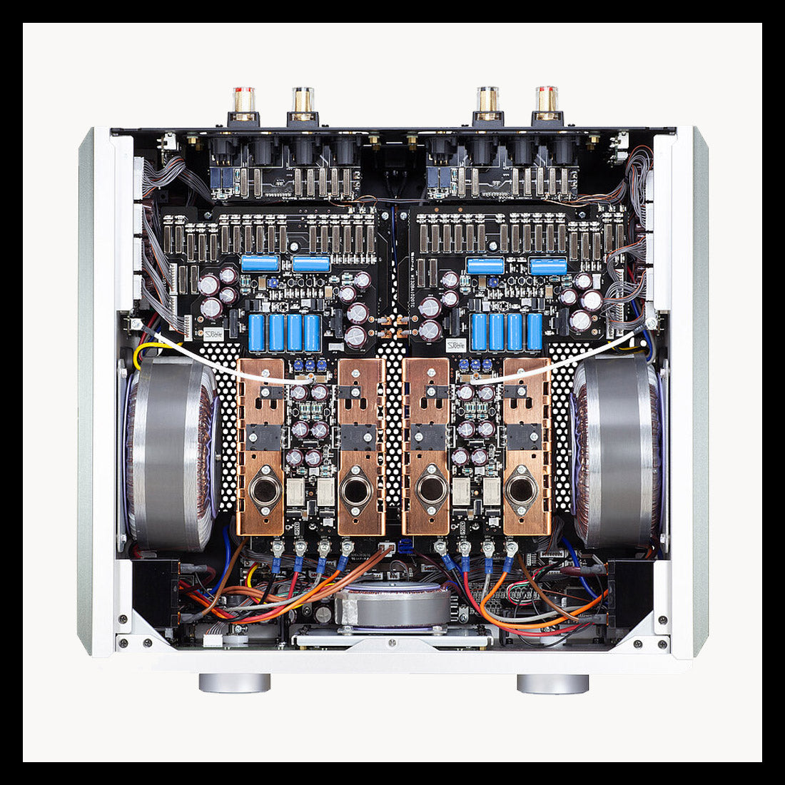 Le bloc amplificateur, les bornes, la prise secteur, le capot supérieur et le capot inférieur ne sont pas fixés, permettant une meilleure gestion des vibrations. Le bloc amplificateur utilise une structure coulissante à trois points avec des curseurs en titane pour minimiser les vibrations nuisibles.