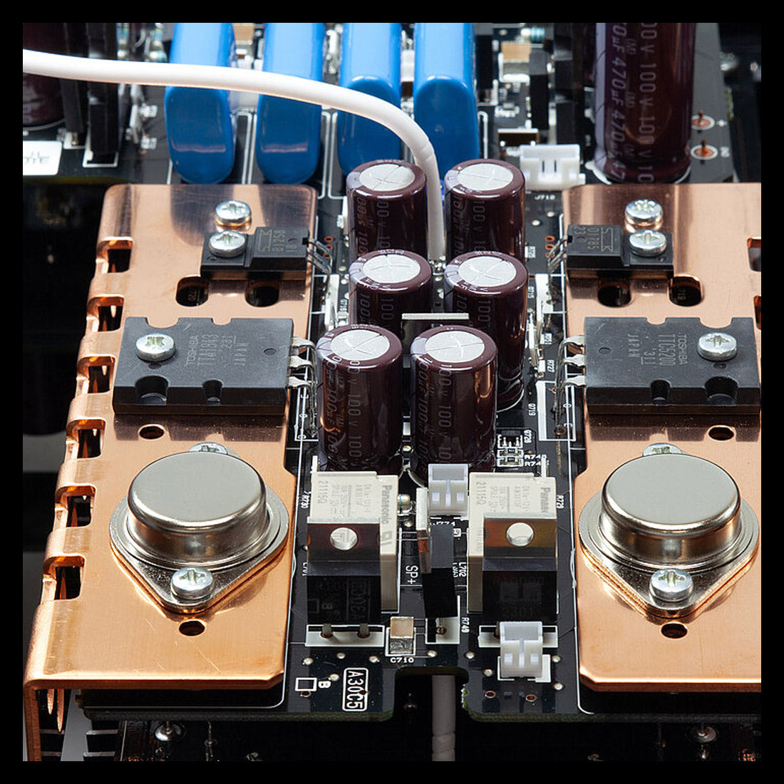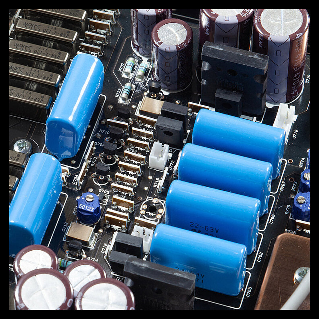 L'amplificateur utilise des condensateurs de filtre spéciaux de 470 uF pour optimiser la capacité et réduire la charge sur le transformateur. Les diodes de redressement SiC de dernière génération assurent une performance rapide et puissante. Deux relais de puissance indépendants garantissent une qualité sonore exceptionnelle.