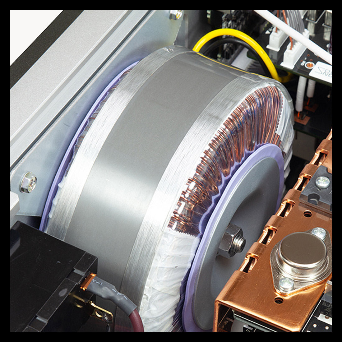 Le Soulnote A-3 utilise deux transformateurs toroïdaux de 700 VA pour l'amplification de puissance des canaux gauche et droit. En plus de cela, trois transformateurs, y compris celui du système de contrôle, sont regroupés dans un seul boîtier. Montés verticalement, ces transformateurs alignent leurs lignes de champ magnétique parallèlement à la carte, garantissant une performance optimale et une réduction des interférences magnétiques.