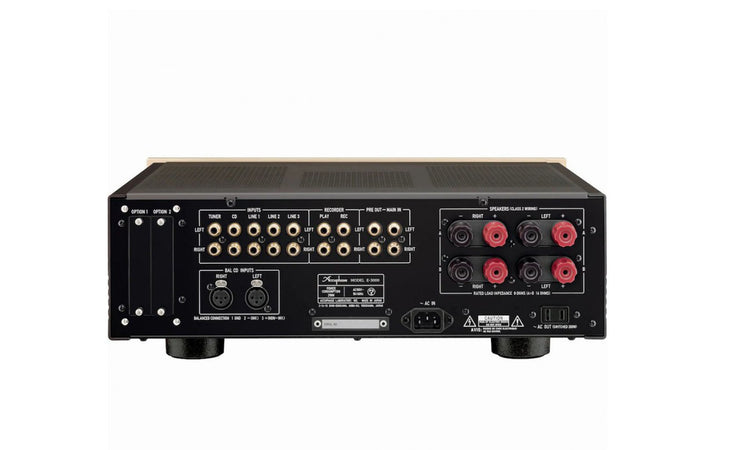 Les sorties comprennent une sortie préamplifiée RCA, une sortie casque en jack 6,35 mm et un double bornier stéréo en configurations A, B et A+B. L’E-3000 offre également deux emplacements pour accueillir des cartes optionnelles, comme un étage de conversion numérique/analogique ou un préamplificateur phono, permettant ainsi d'adapter l'amplificateur aux besoins spécifiques de l'utilisateur.