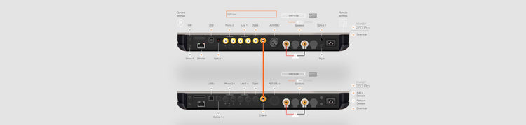 Les deux amplis sont reliés par un câble de chaînage numérique coaxial et un câble de chaînage analogique 3,5 mm (fournis avec l'appareil) et sont configurés via un logiciel pour fonctionner en mode Dual Mono.