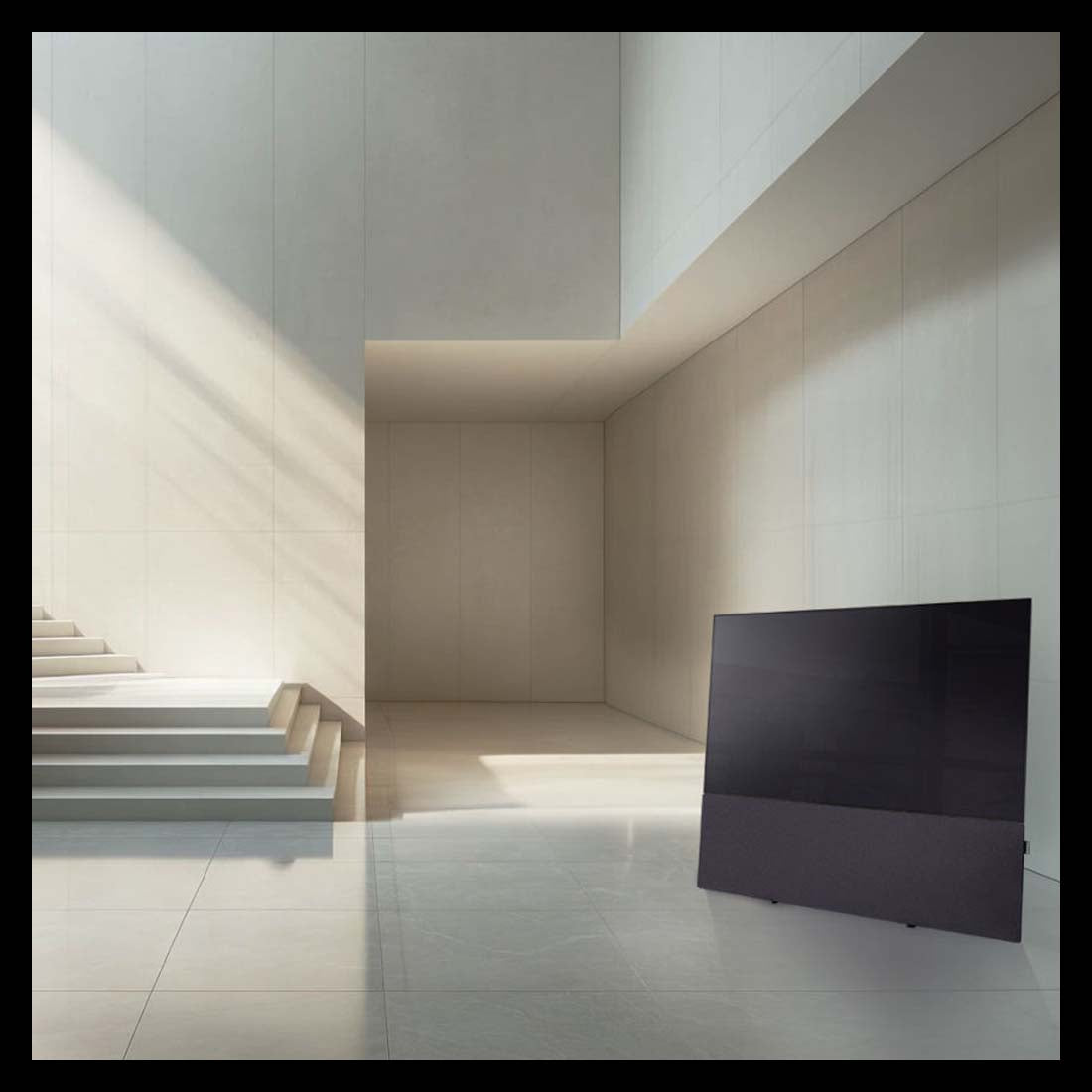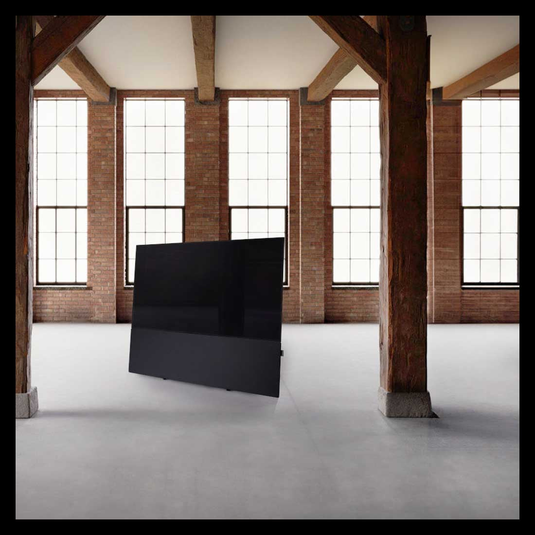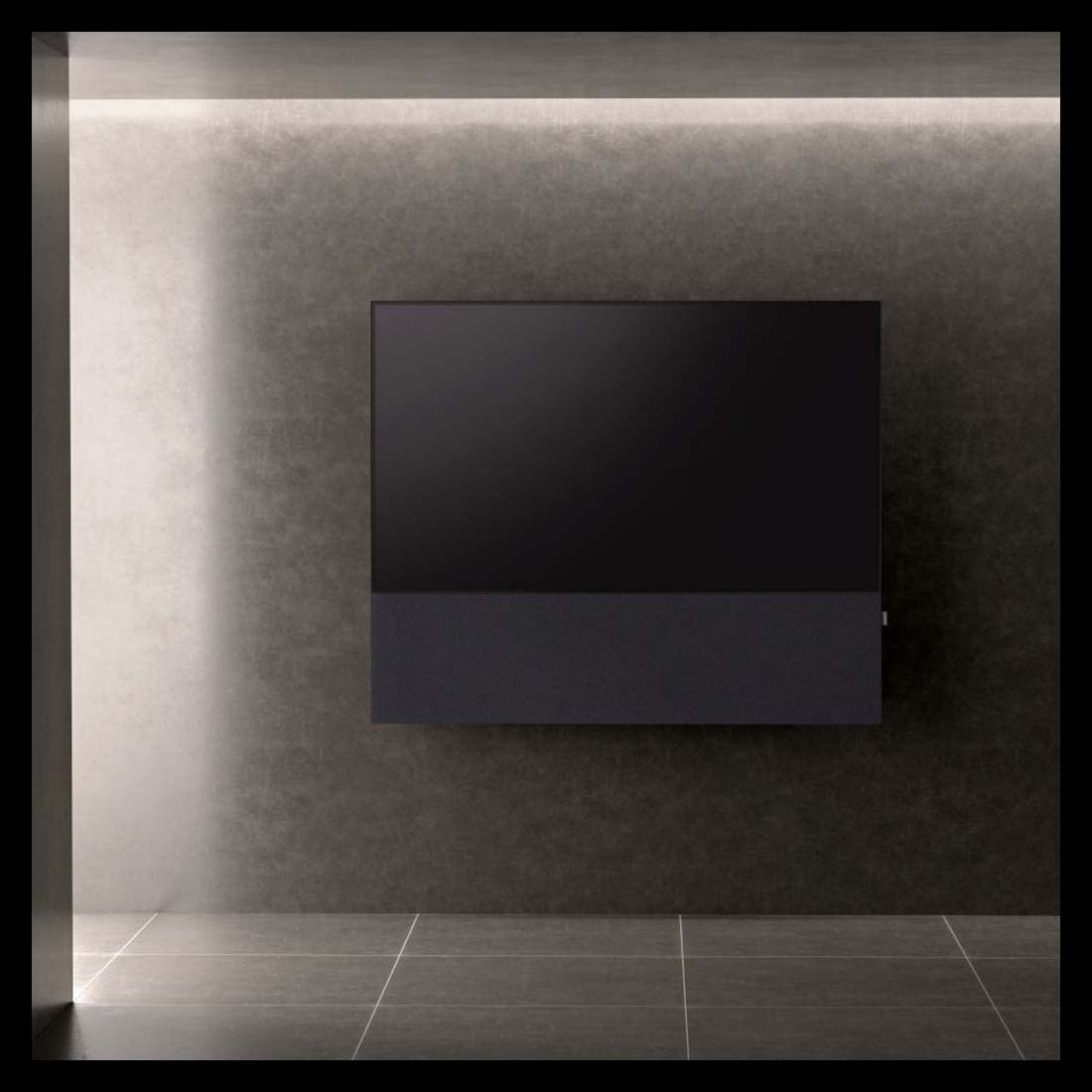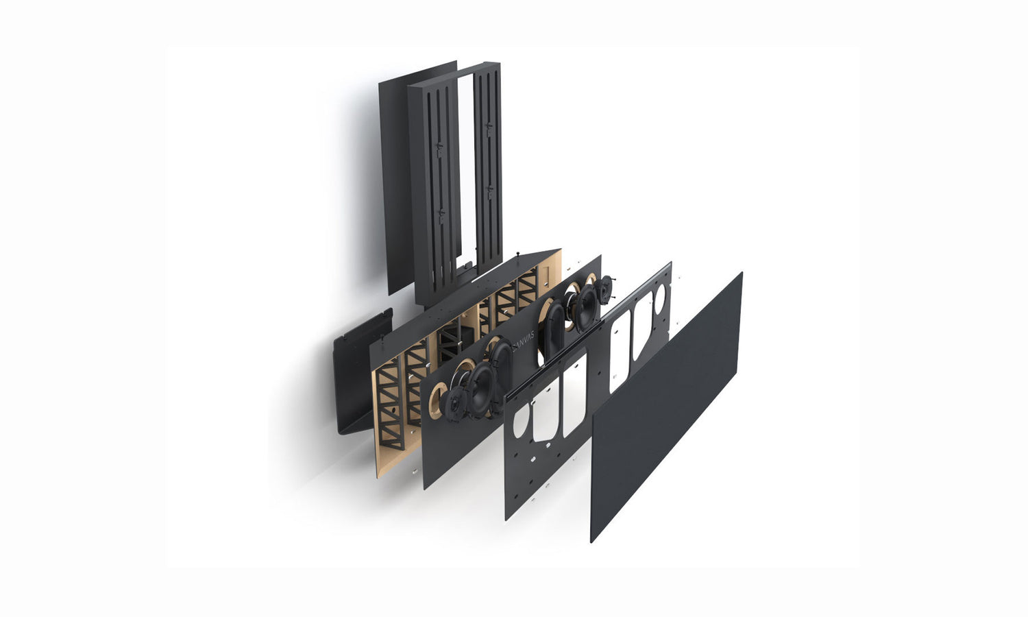 - Grille avant interchangeable : disponible en 12 finitions, incluant des tissus Kvadrat et du bois massif, fixée magnétiquement pour un ajustement parfait à la taille de votre écran (55", 65", 75", 83").