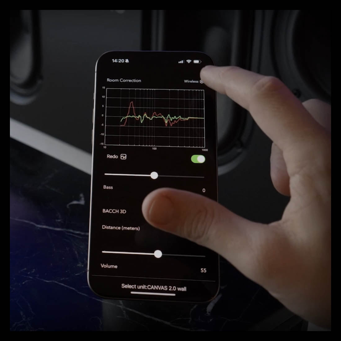 Via l’application CANVAS (iOS et Android) et un microphone intégré ou optionnel (Zen Mic), elle analyse l’acoustique de votre pièce pour éviter des basses envahissantes.