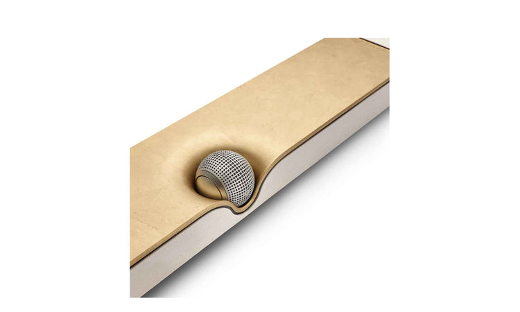 Son ornement central Orb, rotatif selon la position (murale ou posée), symbolise à lui seul la précision et la recherche esthétique de Devialet.