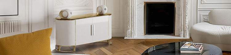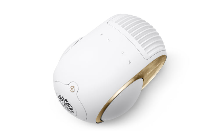 Grâce à ses lignes organiques et à sa finition Gold Leaf, cette enceinte connectée trouve sa place aussi bien dans un décor contemporain que dans un environnement plus traditionnel.