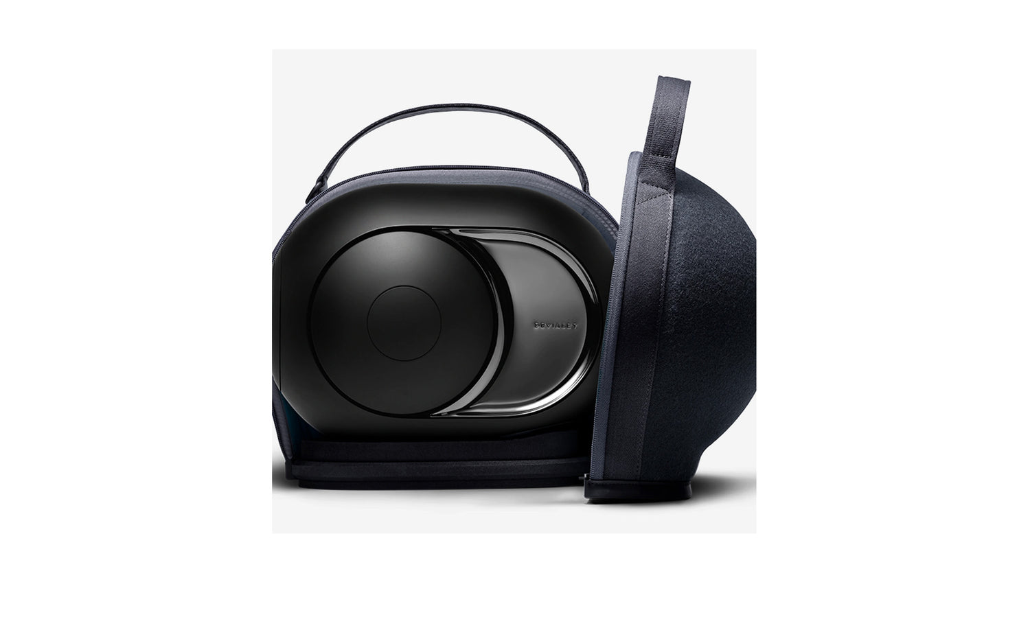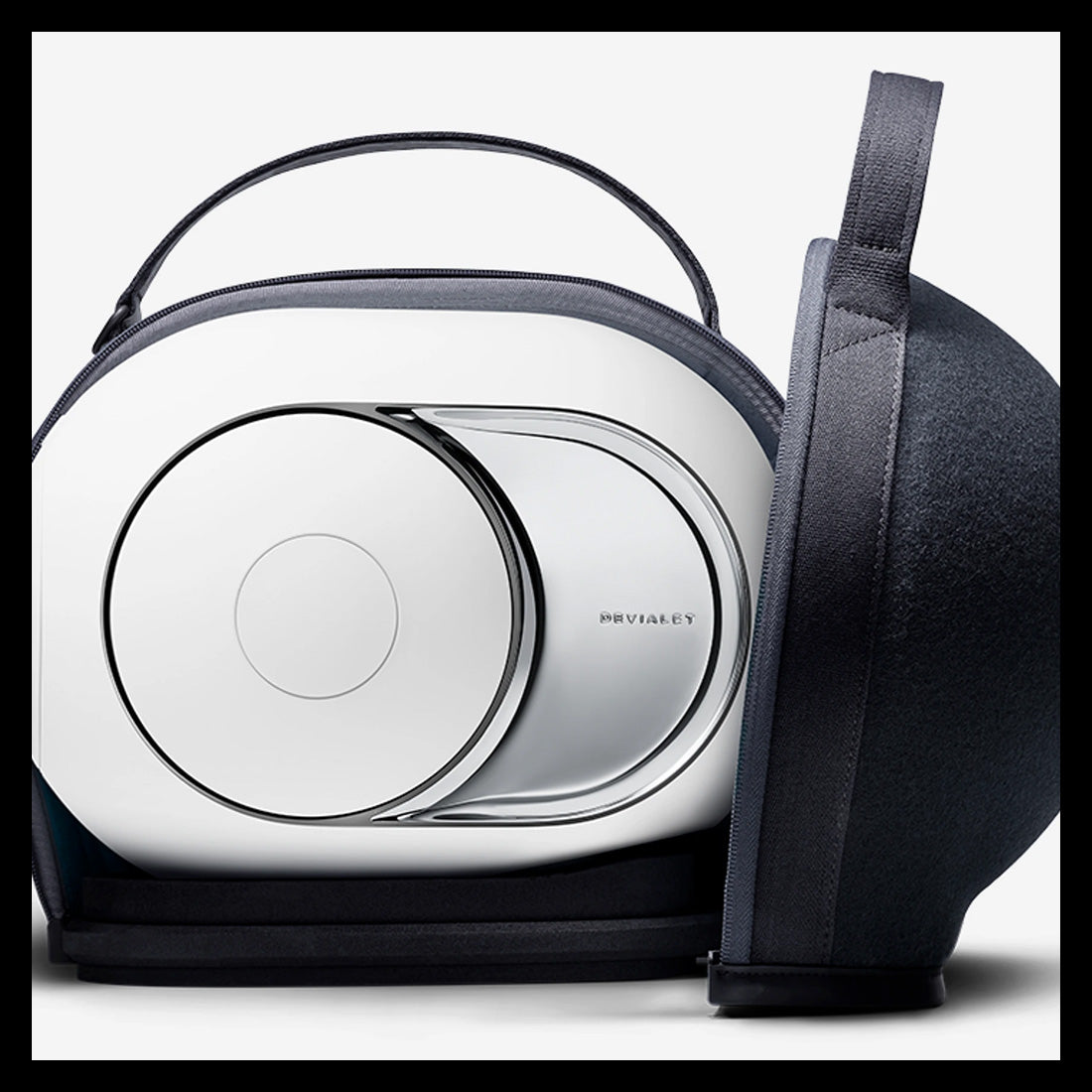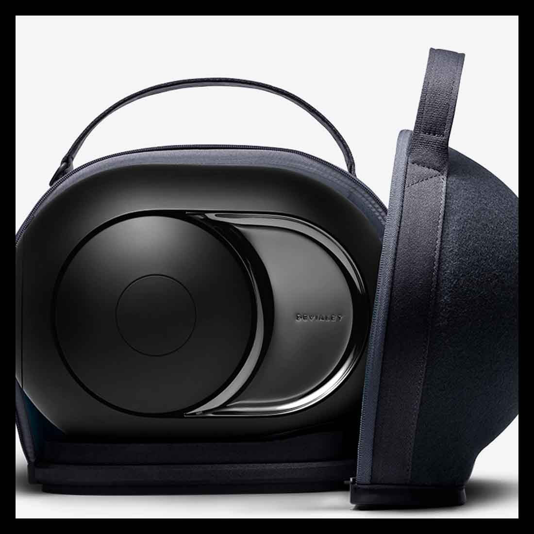 Le cocoon Devialet reprend les lignes de l’enceinte Phantom Ultimate 108 dB pour créer une enveloppe protectrice sur mesure.