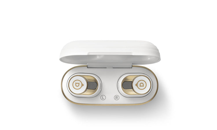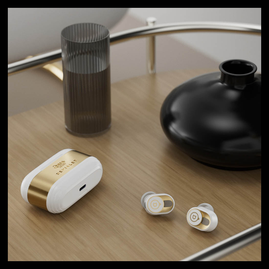Des écouteurs sans fil qui offrent une Réduction de Bruit Adaptative et un mode Transparence, logés dans un boîtier au luxueux revêtement plaqué en or 24 carats.