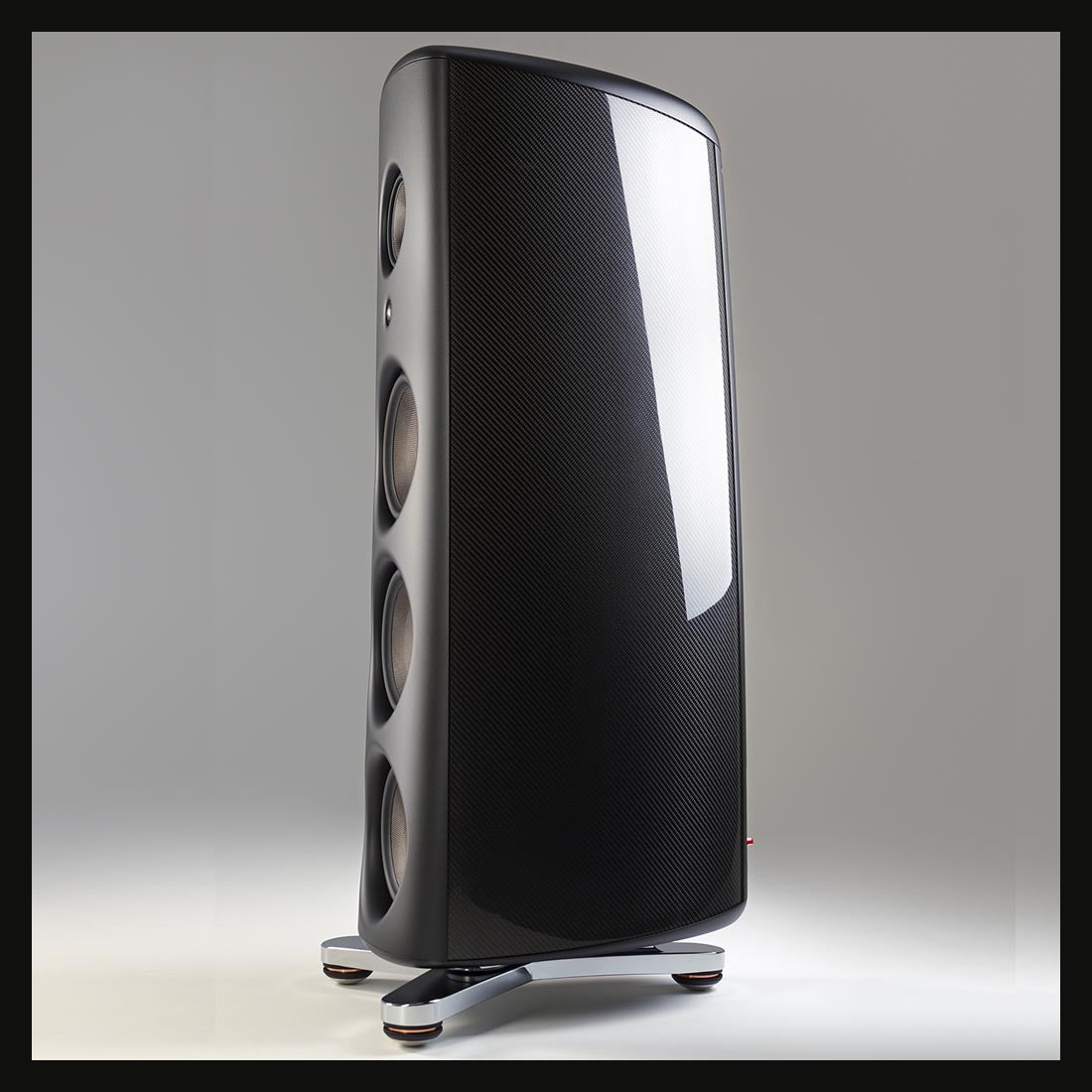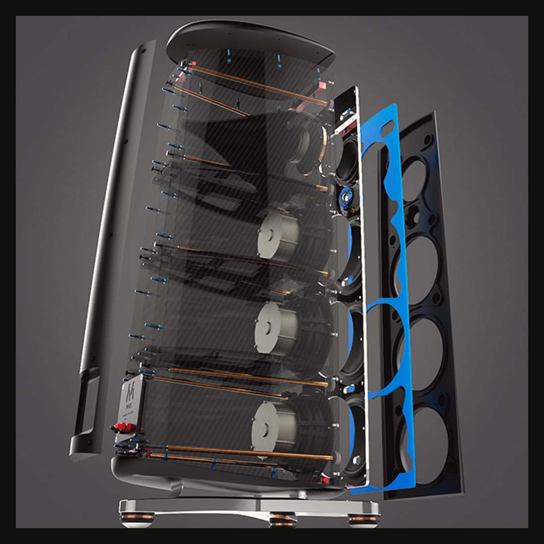 Une nouvelle sous-enceinte en forme de pavillon inversé, confectionnée à partir d'un composite de fibres de carbone exclusif, abrite le haut-parleur de médium et offre une chambre extrêmement rigide mais idéalement amortie, favorisant ainsi la dispersion des ondes stationnaires internes sans recourir à une surabondance de matériaux d'amortissement internes.