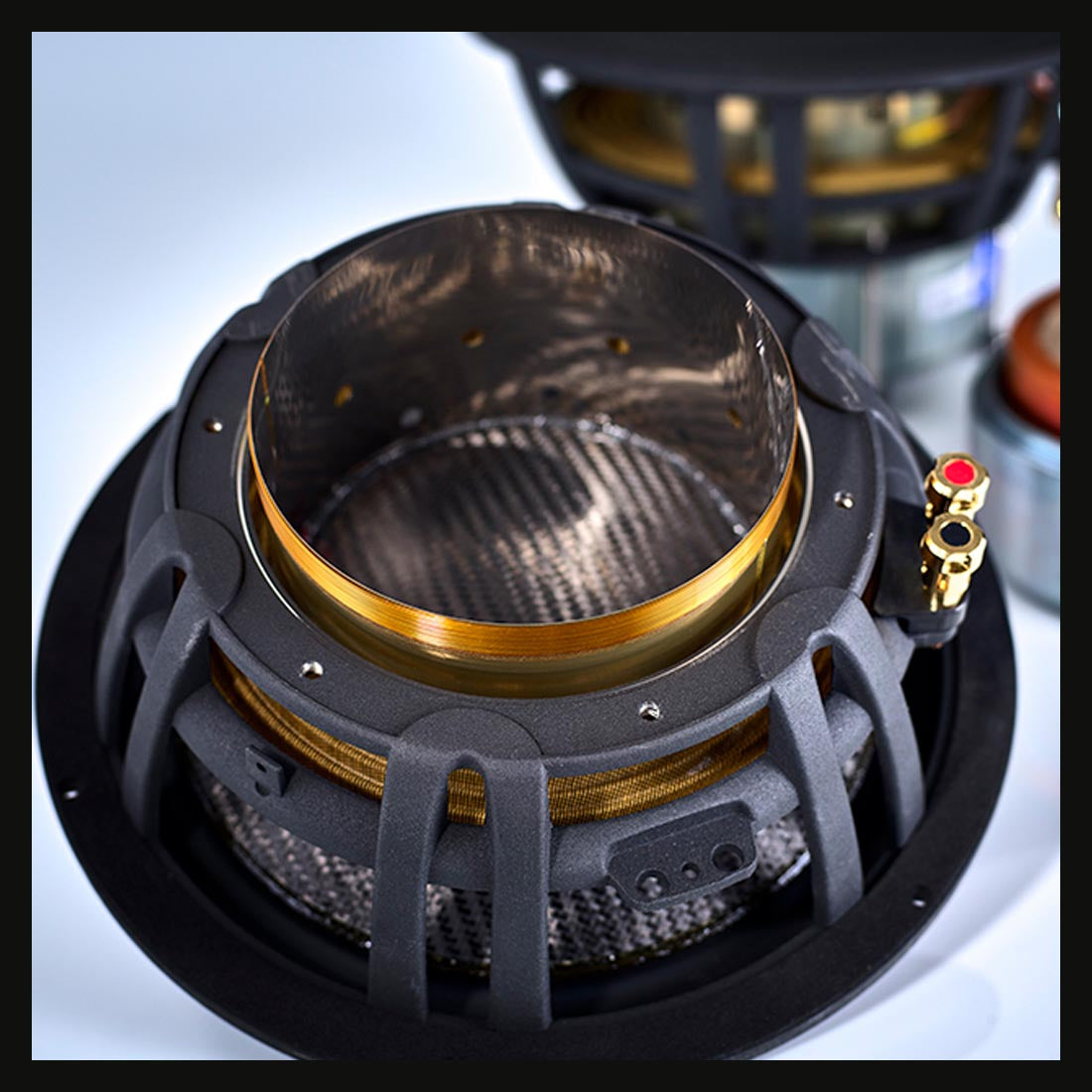 Ce haut-parleur utilise un système moteur sous-dimensionné à base de néodyme, avec des structures magnétiques doubles pour garantir un champ magnétique parfaitement stabilisé de 1,7 Tesla dans un espace d'air de 15 mm, résultant en une bobine vocale en titane à évent pur.