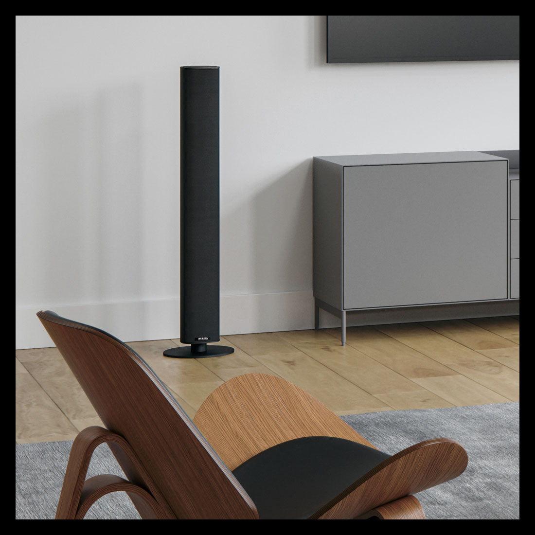 Le socle de l'enceinte colonne présente une base circulaire assurant une stabilité garantie tout en s'harmonisant parfaitement avec le design élancé du boîtier.