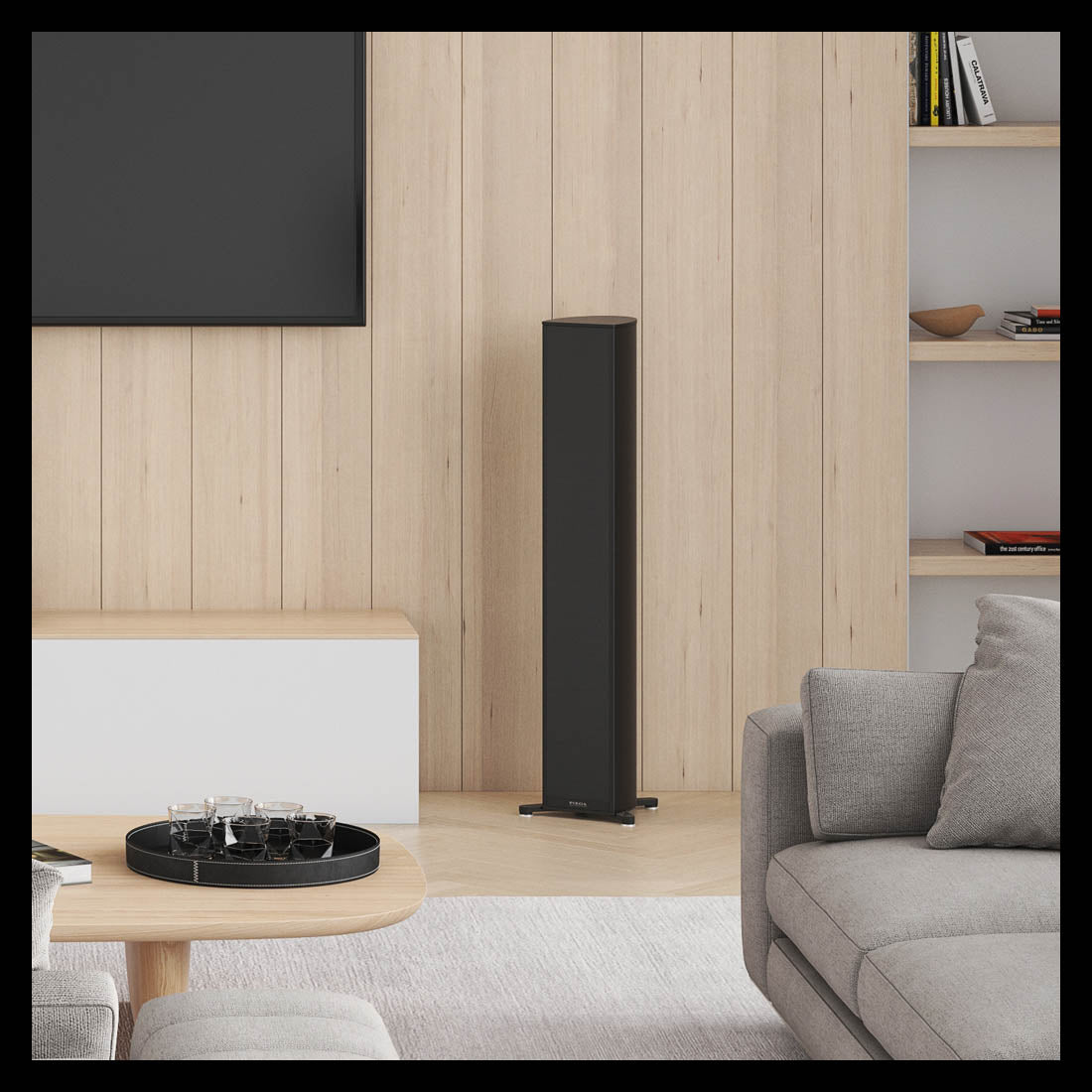 La silhouette distinctive en forme de C de l'enceinte, associée à sa façade affleurante, confère une élégance intemporelle à l'ensemble, faisant de cette enceinte un véritable objet d'art sonore.