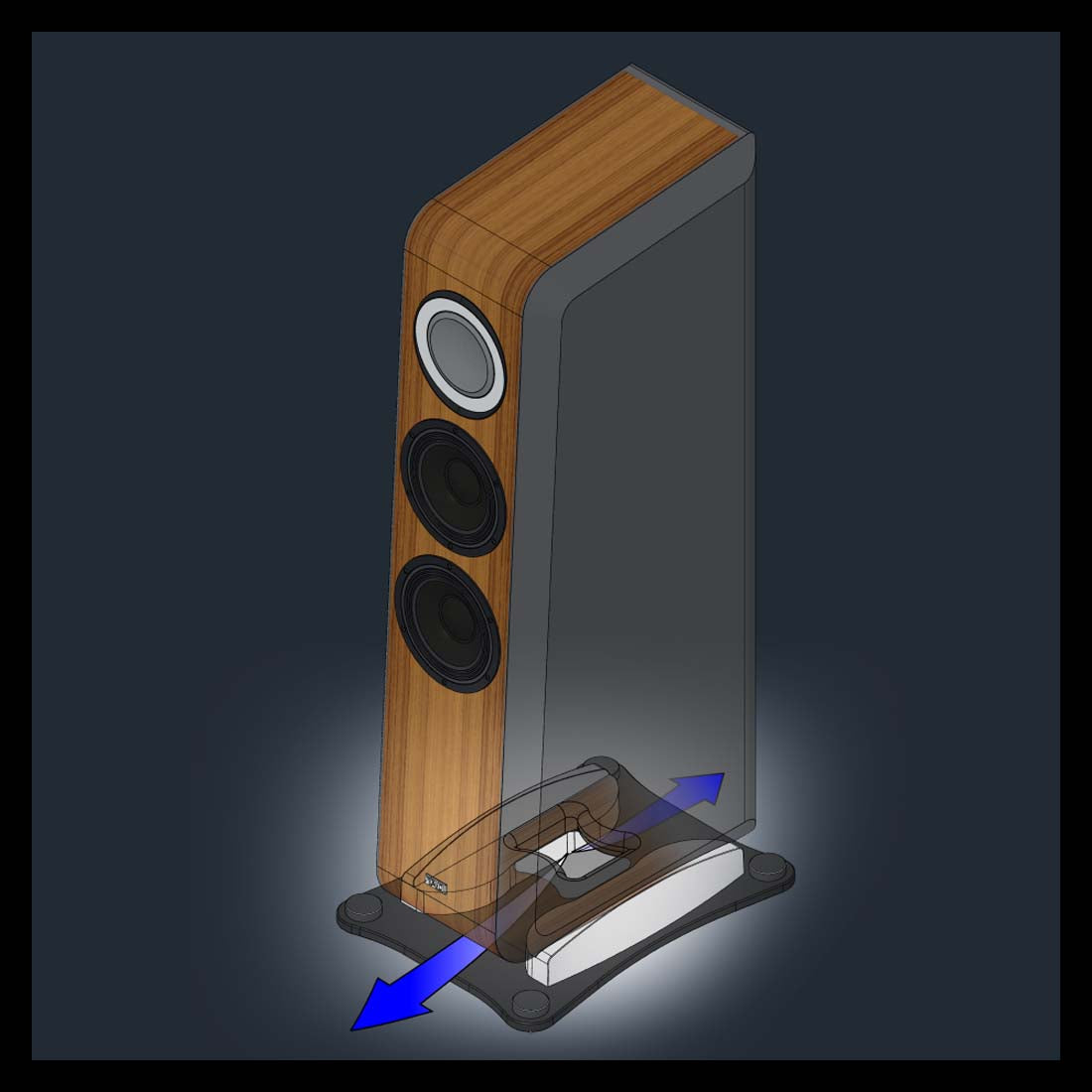 De plus, une plaque de base en aluminium de 15 mm d'épaisseur, fixée au bas de l'enceinte, renforce la stabilité lorsqu'elle est placée sur le sol, contrebalançant les forces motrices de réaction des puissants woofers jumeaux.