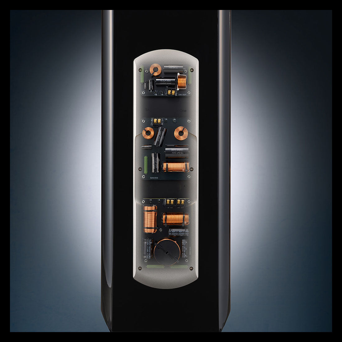 Trois assemblages de circuits imprimés (un pour le tweeter, un pour le médium et un pour les woofers) sont montés séparément à l'intérieur du boîtier pour minimiser les risques d'interférences entre eux.