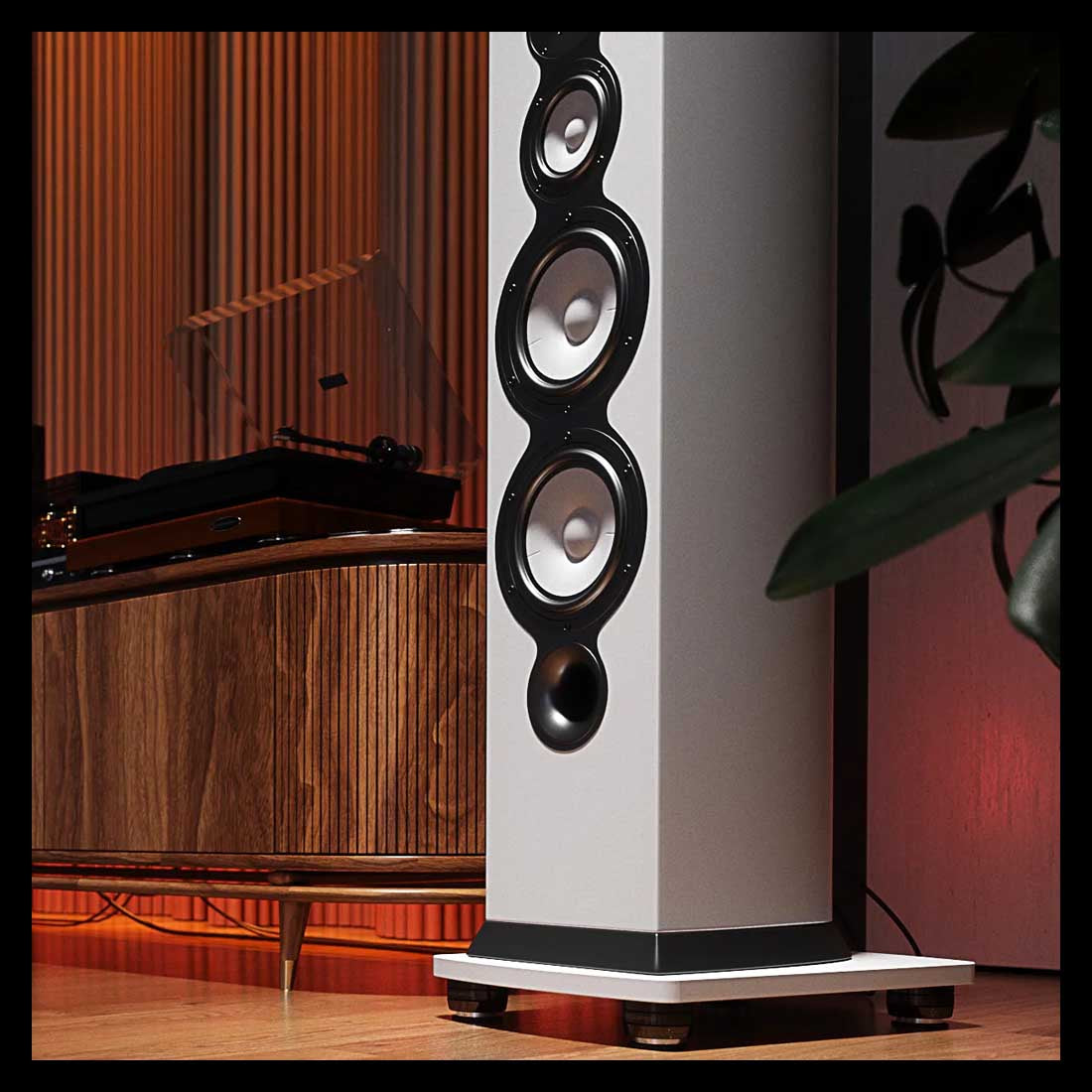 Cette orientation garantit une résistance accrue aux mouvements latéraux et aux oscillations hors axe, contribuant à la stabilité de l’enceinte et à la précision de l’image sonore.