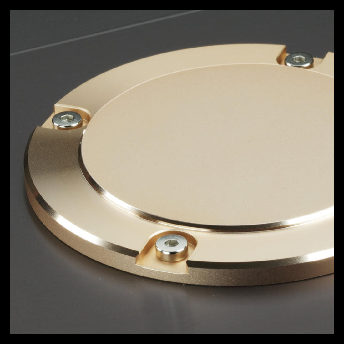 Le plateau de disque élégant du DP-770, sculpté à partir d'un bloc d'aluminium et traité avec une anodisation dure en aluminium ainsi qu'un fini satiné, assure une ouverture et une fermeture silencieuses et fluides.