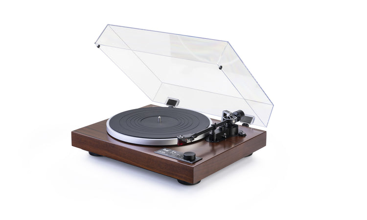 Disponible en deux finitions de vinyle de qualité, imitant le bois noir veiné ou le noyer, la platine repose sur des pieds en élastomère pour une stabilité accrue.