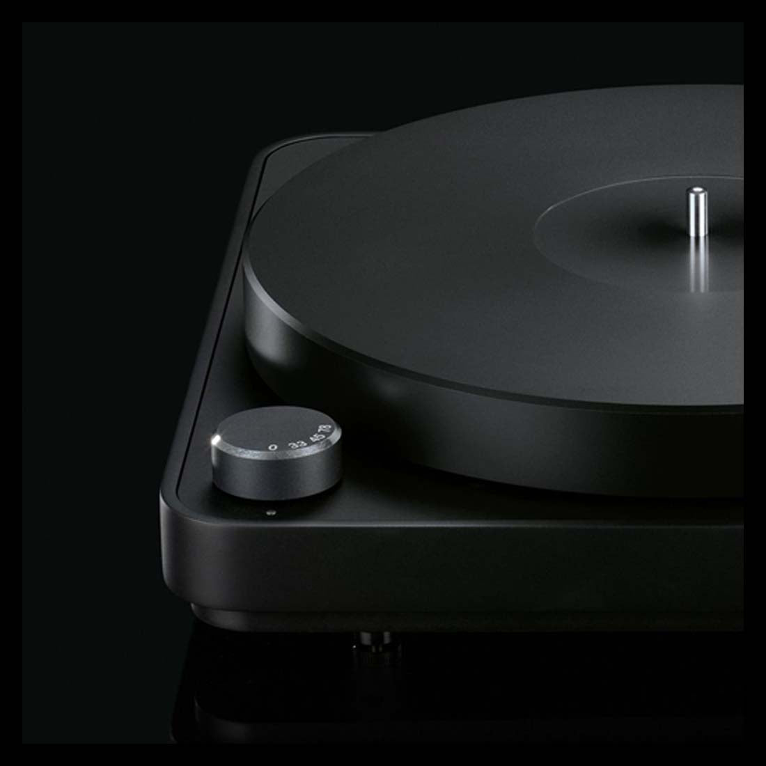 Plateau massif en POM (polyoxyméthylène) ou acrylique équilibré dynamiquement avec moteur à entraînement par courroie, une alimentation externe, roulement à faible bruit et un axe de plateau en bronze.