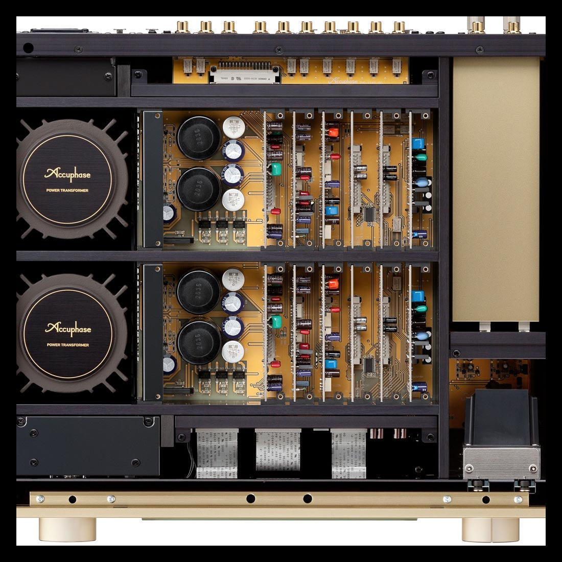 Le C-2900 hérite intégralement de la conception interne du C-2850, adoptant une disposition symétrique pour une alimentation puissante grâce à un vaste transformateur toroïdal muni d'ailettes de rayonnement thermique, accompagné de 4 condensateurs sur mesure de 10 000μF chacun.