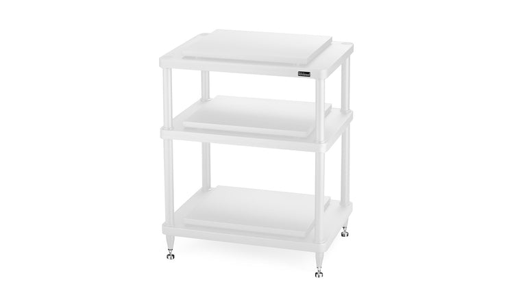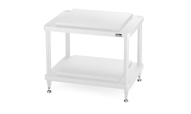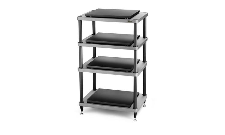 Les étagères inférieures, appelées “X Plates”, sont positionnées sur les plus grandes grâce à quatre cônes en aluminium par niveau. Ce design permet à chaque étagère de s'adapter parfaitement et d'amortir les vibrations de manière optimale.