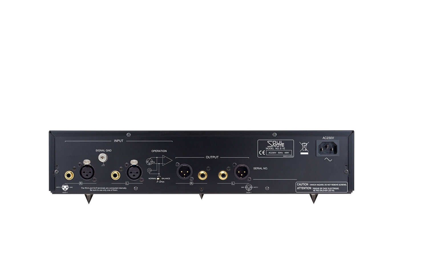 Le SoulNote E-1 prend en charge les entrées de cellule symétrique, avec un panneau arrière équipé de bornes XLR et d'un sélecteur de fonctionnement.