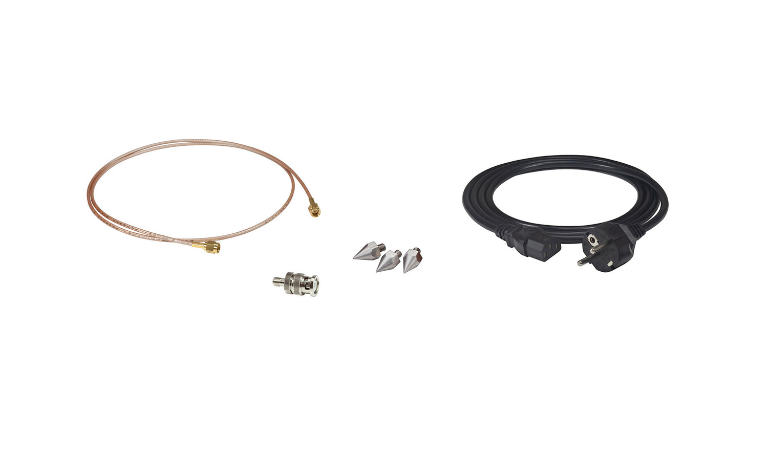 câble SMA–SMA, adaptateur SMA–BNC, pointes, câble d’alimentation